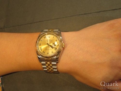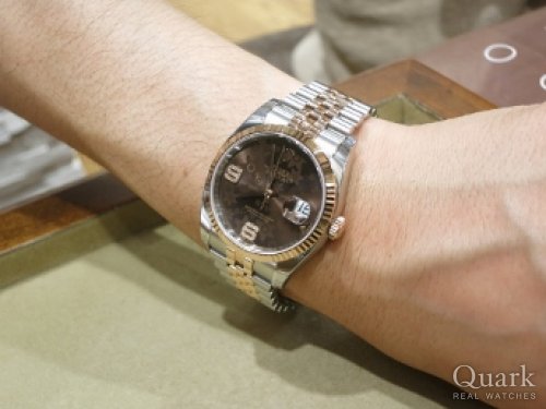 スポーツモデルと選択に迷いましたが、スーツ着用率が高い私は、ピンクゴールドにフラワー柄のブラウン文字盤が極めて映えるこのメンズモデルに決めました。数字上に美しくセッティングされたダイヤモンドが時計全体を引き締め、お洒落度をアップしてくれています。 いつもこまやかな心づかいをして頂くクォーク仙台店の麻生様には2003年からずっとお世話になり心から感謝しております。これからもよろしくお願い致します。