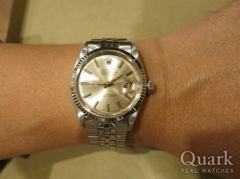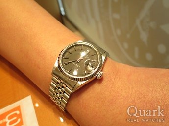 I様 この度はクォーク銀座888店をご利用頂きまして誠に有難うございます。36mm径(ブレス20mm)の60年代ヴィンテージ・デイトジャストの中でも圧倒的に数の少ないスムースベゼルですが、I様の仰るとおり控えめながら、とても良い雰囲気ですね。さらにオリジナル文字盤のマットブラックとインデックスが全体を引き立てています。50年以上も前に造られた時計が、今、この時代にI様に受け継がれ動き続けている、、奇跡のような出会いですね^^ I様の知的でお洒落な雰囲気にもとてもよくお似合いです。どうぞ末永くご愛用くださいね。クォーク銀座888店 須永