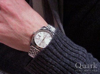 デイトナを使っていますが、気軽に使えて長く愛用出来る時計が欲しいと思っていました。他に文字盤違いのホワイトローマやグレーローマ、デイトジャストIIとも迷いましたが、長本さんのオススメで、シルバーに決めました。