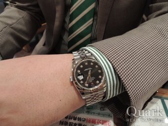 I様、この度はクォーク梅田店をご利用頂き本当にありがとうございました。同じ接客業ということで、I様にもお気遣い頂きいただき非常に恐縮いたしました。今回ご購入のデイトジャストは上品なホワイトゴールドに精悍なブラックフェイスの10Pダイヤが映え、I様にとって最適なモデルだと思います。今後もアフターメンテナンスを含め全力でサポートさせて頂きますので、末永いお付き合いを頂けますようお願い致します。