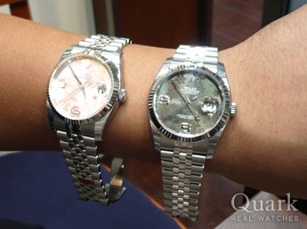 奥様のお話では、ご主人様は本当に腕時計が大好きで、当店のカタログを毎晩ご覧になられていらっしゃったのですね。その中でお選びになられました今回のペアウォッチ。今夜からはカタログではなく、こちらのデイトジャストをゆっくりご覧になられることと存じ上げます。