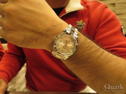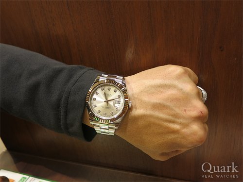 A様 この度は、私共クォーク仙台店をご利用頂き、誠に有難う御座います。ご来店からモデル決定までの決断のスピードにビックリ致しましたが、妥協の無い選択と周りの皆様のお言葉から、間違いない1本だと感じました。10ポイントダイヤの輝きや、ホワイトゴールドのベゼル、ベルトの鏡面仕上げ等、高級感を存分に感じて頂けるデザインの上、デイトジャストII は、41ミリという存在感のある大きさも魅力です。是非、傷を気にせずご使用頂き、ロレックスの魅力を楽しんで頂けましたら幸いです。また、ロレックスに詳しい方が沢山いらっしゃいますので、是非皆様と一緒にロレックスの話で盛り上がってくださいね。心配な事や疑問等は直ぐに解決されるかもしれませんが、何か御座いましたらお気軽にご連絡頂けたらと思っております。店頭ではブレスレットのクリーニングも承っておりますので、仙台にお越しの際は是非お申し付けください。お待ち致しております。この度は、誠に有難う御座いました。今後とも、末長いお付き合いの程、どうぞ、宜しくお願い致します。 クォーク仙台店 麻生