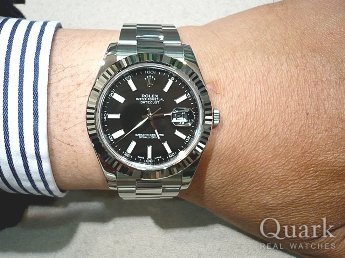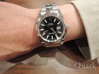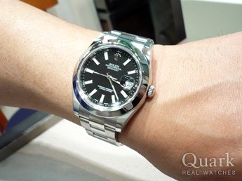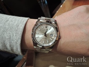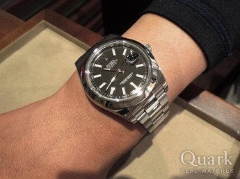 当初はエクスプローラーIとデイトジャストで迷い、日付を見る機会も多いのでデイトジャストの方向へ・・。しかし、今度はデイトジャストとデイトジャストIIのサイズで悩みました。実際に試着をしてデイトジャストIIに決めました。