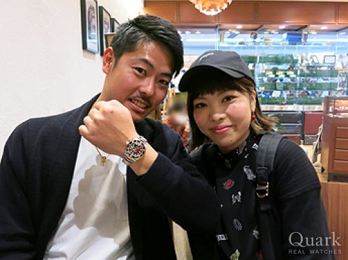 K様 この度はクォーク名古屋店をご利用頂き、誠にありがとう御座います。お選び頂いたサブマリーナー コンビモデルは、ステンレスと違った華やかなさのあるゴージャスさが魅力的です。ブラックとイエローゴールドとの組み合わせが、一層高級感を醸し出しますね。個人的にもK様の雰囲気に抜群に似合っておりましたので、このモデルしかないと感じました!また嬉しそうな表情が印象的で、私自身もご担当に携われ、嬉しく感じました。素敵なお写真まで頂き、ありがとう御座います!今後のサポートに関しても、私が精一杯努めさせて頂きますので、ご遠慮無くご相談下さい。また栄にお立ち寄りの際は、ブレス洗浄を兼ねて遊びにいらして下さい。またK様にお会い出来る日を楽しみにしております。