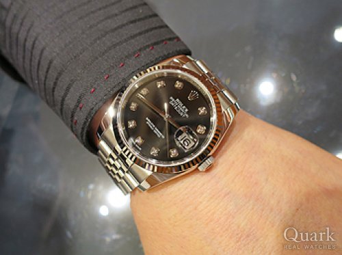 クォークさんへ訪れたところ、デイトジャストの10Pダイヤの時計が丁度あり、他の時計とも見比べた結果、この黒文字盤のデイトジャストにしました。今日は下見のつもりだったんだけどな(笑)門脇さんに上手に乗せられました!でも、良かったです!!大事にしますね。ありがとう。