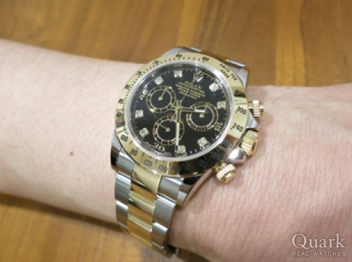 始めはヨットマスターとデイトナで迷っていましたが、実際見比べてみると、デザイン性・存在感などすべてにおいてデイトナの方が勝り、このモデルに決めました。また何よりも黒文字盤に映える8つのダイヤはとても魅力的です。これから大切に使っていきます。