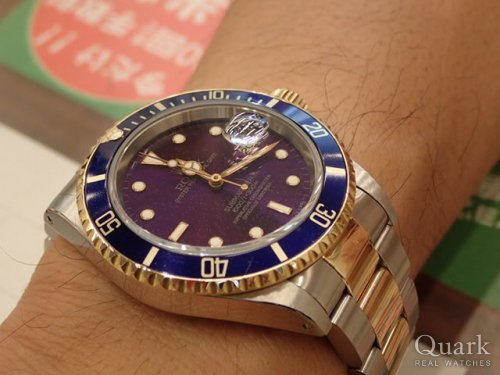 経年変化の色ダイアルと言えば、ブラウンやアイボリーですが、今回「909の日」で出会った青サブは、バイオレットからパープル、そしてボルドーに近い色合いまで、光の角度と加減で様々な表情を見せてくれます。これまた経年変化による斑点さえも、深いバイオレット色を背景に大宇宙に散りばめられた星屑さながらの一大パノラマを演出します。(私にとっては)「紫」なんて、もし既製ダイアルとしてリストにあってもあえて買い求める色ではありません。偶然の産物だからこそ、はっと息を飲むような思いがけない美や魅力を見出すのも事実。 この時計との邂逅は、そんなロレックスの新たな魅力をまた発見させてくれました。いつもながらさり気無く、このダイアルの持つ奥行きを教えてくださった佐藤さんに感謝‥‥であります。