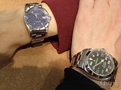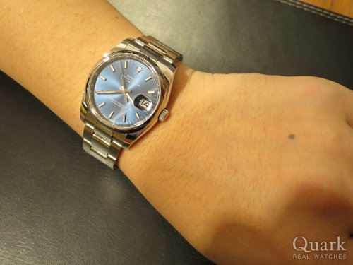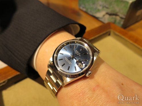 M様 いつもクォーク上野本店をご利用頂き誠にありがとうございます。今回はオイスターパーペチュアル Ref.15200のご購入のお手伝いが出来た事、大変嬉しく思います。ここ最近、時計サイズが大型化しておりますが、今回ご購入頂いたお時計は34mmと小振りで重量も約98gと軽くとても使い易いお時計となります。また上品なブルー文字盤が爽やかな印象を与え、これからの季節にピッタリな1本です。ご使用頂きしっかりとサポートさせて頂きますので今後、お時計の事で何かございましたらお気軽にご相談下さいませ。宜しくお願いいたします。