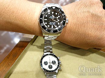 A様 いつもクォーク仙台店をご利用くださいまして、誠にありがとうございます。今回は迫力があるダイバーズウォッチ「ディープシー」でございますね! 重厚な作りとビッグサイズのケース、高い防水性と大変魅力的なモデルでございます。是非日常でご愛用頂けましたら幸いでございます。また、以前ご購入くださいました手巻きデイトナも一緒に、お写真を頂戴しましてありがとうございます。(写真が不鮮明で申し訳ございません・・・。)使い分けて頂くのも、これからの楽しみになると思います。どちらのお時計もしっかり対応させて頂きますので、末長いお付き合いの程、宜しくお願い致します。
