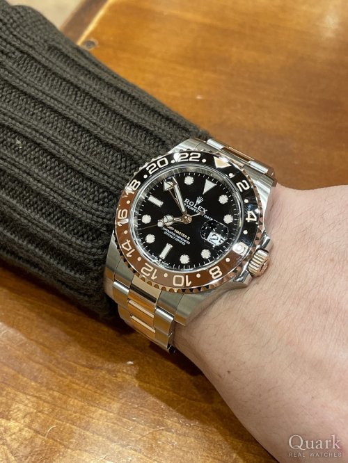 S様 この度はクォーク新宿店をご利用いただき誠にありがとうございました。この度ご購入いただきましたGMTマスターII Ref.126711CHNRは2018年に登場して以来、高い人気を誇るモデルでございます。ブラウン×ブラックのツートンカラーのベゼルと、ピンクゴールドの組み合わせがとても格好良いモデルですね。