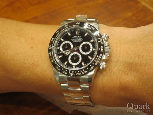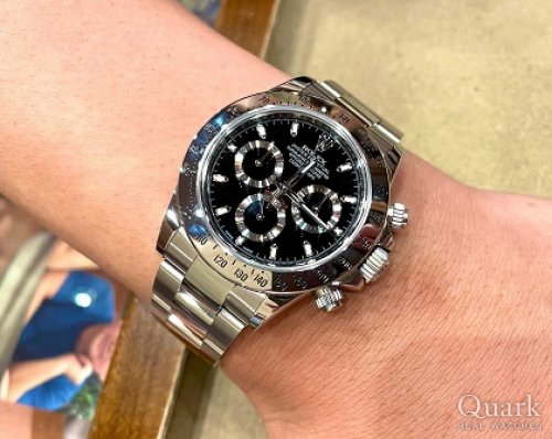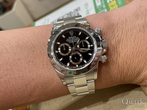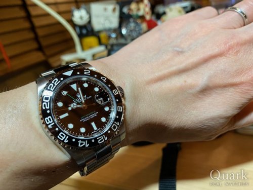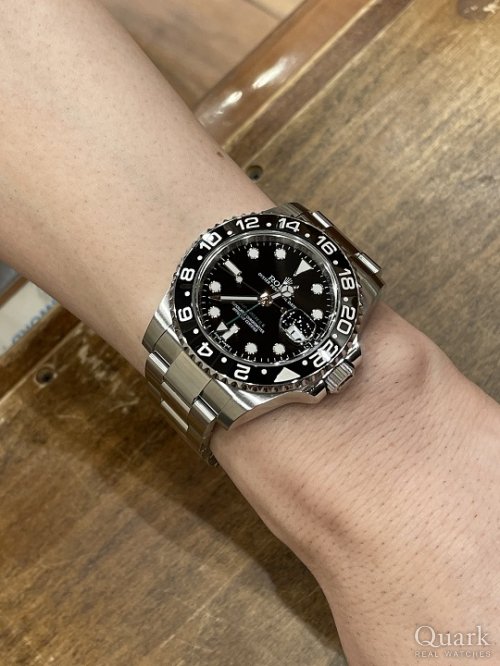 K様 日頃より私共クォークをご利用頂き、誠にありがとうございます。また、素敵なお写真を頂戴いたしました事、重ねてお礼申しげます。人気モデルの為ご準備にお時間を頂戴しましたが、デットストックのいい個体がK様へご案内でき私も嬉しく存じます。今回お選びいただきましたRef.116710LNは全体的に黒で統一されたデザインの中に、グリーンのGMT針と文字盤上のモデル名表記がアクセントとなっており、高級感の中にどこか可愛さも感じられるモデルでございます。生産終了した今も大変人気の高いモデルとなっており、装いやシーンを問わずご愛用頂ける魅力的なモデルでございますので、K様のよきパートナーとして末永くご愛用頂けましたら幸いでございます。今後もご指名頂けますよう、しっかりとサポートをさせて頂きますので、何かご要望などございましたら、私山田までお気軽にお申し付けくださいませ。また、ブレスレットの洗浄及び調整も無料で行っておりますので、お近くに来られた際には是非遊びにいらして下さい。心よりお待ち致しております。今後ともよろしくお願いいたします。 クォーク新宿店 山田