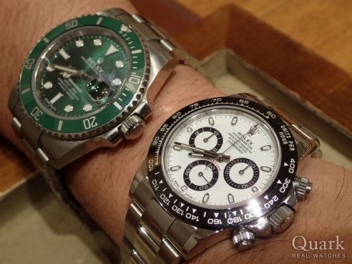 当初、116500LNの黒文字盤の購入を検討しておりました。 クォーク心斎橋店に相談させて頂いた際に、 ●下取のRef.116523Gの査定額が高かった事 ●試着させて頂いた白文字盤の印象があまりにも良かった事 ●西口さんのススメもあった事 が決め手になり、白文字盤の購入を決めました。 持っているロレックスのバリエーションを考えると、白文字盤に決めて本当に良かった。