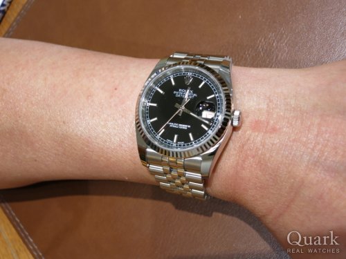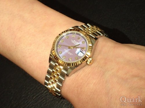 U様 いつもご主人様にお世話になっております。奥様の時計もクォークでお選び頂きまして、誠にありがとうございます。時計見て頂いていたご様子は一目惚れしたように感じました。お選び頂きましたデイトジャストの28mmサイズは旧型より大きく見やすくなっております。反面でブレスレットは薄型の仕様に変更されており、ボリューム感が抑えられており着用感も良くなっております。ラベンダー文字盤はこのモデルからの新色で大変綺麗な印象の時計です。永くご愛用頂けましたら幸いでございます。気になる部分やご不明点などございましたら、お気軽にご連絡下さい。今後ともクォーク心斎橋店もよろしくお願い申し上げます。