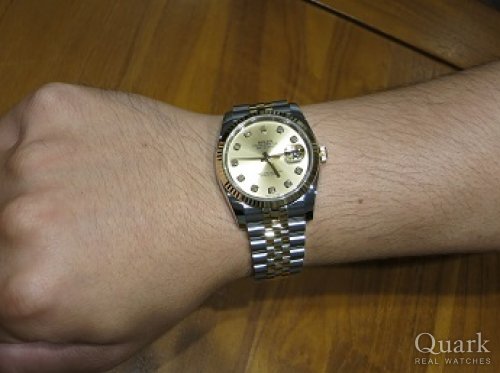 ゴールドの文字盤の時計を探していて、コレが一番キレイでインパクトがあったので選びました。写真より実物のほうが断然キラキラしていて光に当たると更に輝きが増します。文字盤についているダイヤもとってもキレイです。店員さんの対応もすごく親切だったのでこの店で購入して良かったです。
