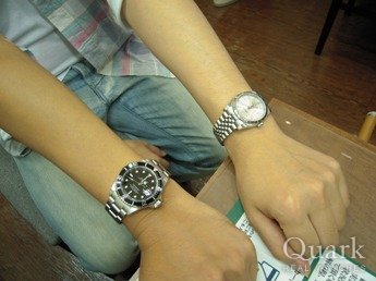 結納返しの品として検討を開始。個性を大切にしたいため、あえてツートンの文字盤と カレンダーの赤黒表記のものを中心に検討。 最終的には他店にて試着してみて、クォークさんであえて購入しました。