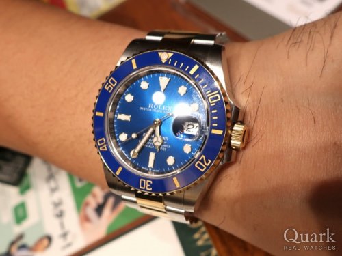 いつもお世話になっている西口店長と何気ないメールのやり取りで始まったちょっとした青サブの話題が大盛り上がりに盛り上がってそれが急展開し「本気買い(マジ買い)」の商談モードとなり・・・色々と考えながら、西口店長にも親身に相談してもらい、頑張っていただき、最終的には、心晴れてこのモデルをGETすることができました。金無垢モデルは数本所有していますが、着け比べてみてもやはり、青サブは青サブなりの独特の雰囲気と着け心地があり、無垢モデルのバリエーションが増えてとても喜んでいます。 またダイヤルの「ロイヤルブルー」にもものすごく惚れ込みました。 西口店長とは17年以上の長いお付き合いで毎回購入の際には本当にとても的確でわかりやすいアドバイスをしてくださり、いつも素晴らしい個体と私を引き合わせてくださいますので本当に感謝しています。今年の夏は半袖のポロシャツ、カジュアル着の腕元に映えるであろうYGの青サブでファッショナブルに決めたいと今からとても楽しみにしています♪♪ でもなんだか「怖いなぁ・・・」という気もいたします・・・。???? 次は無垢のGMTマスターⅡを狙いたいところです!! その時は西口店長〜!! またよろしくお願いいたします。笑