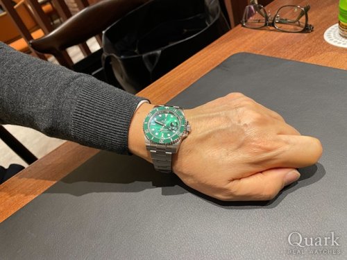 H様、この度はクォーク仙台店をご利用いただきまして誠にありがとうございました。ロレックスのコーポレートカラーでもあるグリーンがベゼルに採用された通称『グリーンサブ』は、プレミアム性が非常に高い人気モデルです。サブマリーナーならではのスポーティなデザイン性と、グリーンサブならではの特別感を存分にお楽しみいただけるモデルとなっておりますので、H様の素敵な機械式時計のコレクションの1本として末永くご愛用いただけることと信じております。また、H様と機械式時計のお話ができるのを楽しみにしておりますので、お時間ございましたら是非クォーク仙台店に遊びにいらしてください。