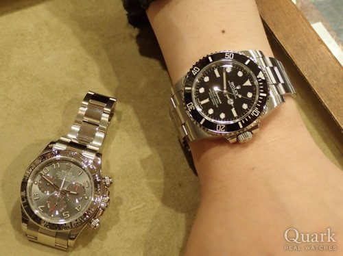 Y様 いつもクォーク仙台店をご利用くださいまして誠にありがとうございます。またまた買っちゃいましたね!豪華すぎるツーショットに私がびっくりです(笑)。お写真をみているだけでもウットリしちゃいますね~。今回もY様にご満足いただけて本当に嬉しいです。Y様に楽しんでいただくはずが、Y様のお話が面白すぎて私の笑いが止まらず大変失礼いたしました。まさか、あんなところからデイトナちゃんがでてくるとは・・・、反則ですよ~(笑)。Y様だからこその発想に今でも思い出すと笑っちゃいます。クッション性抜群のアイディア、勉強になります(笑)。さて、野球にはどの子を連れて行かれるのでしょうか。今度教えてくださいね!引き続きY様に喜んでいただけますよう、私もしっかりお手伝いいたしますので、なにか気になることがございましたら、いつでも高橋までご連絡くださいませ。もちろん新しく気になるモデルがでましたらご相談も随時お待ちしております!いつもキレイにご愛用されていらっしゃるので、必要ないかもしれませんが・・・ブレス洗浄のご依頼もお待ちしておりますよ~♪あ、今度I様にお会いするときにはさりげなく自慢してくださいね☆自慢する前に、鮮やかなグリーンサブが袖からちらりと見えただけでもバレてしまいそうですが(笑)。それではこれからも変わらぬご愛顧を賜りますよう、宜しくお願い申し上げます。