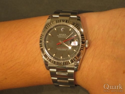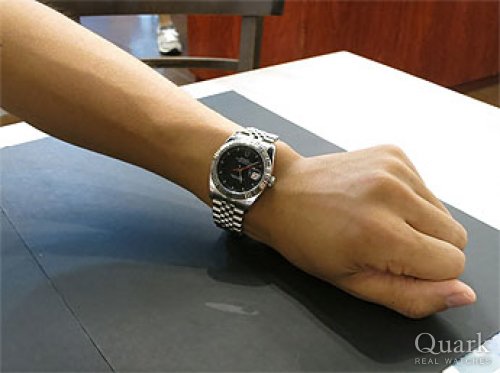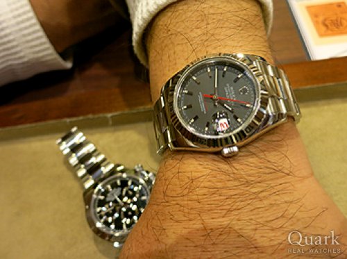 一年位前から待ち望んでいた、念願のターノグラフ日本限定白文字盤を購入しました。 これで日本限定の黒文字盤と白文字盤が揃いました! この二本が揃えばもう、ターノグラフは充分満足です(笑) ターノグラフは満足したので、ターノグラフ青文字盤を旅に出させてその代わりにDJⅡグレーグリーンローマを一緒に購入しました(笑) 前回に引き続き今回も二本買いになってしまいました(笑) では、尾崎副店長、また宜しくお願いしますね!