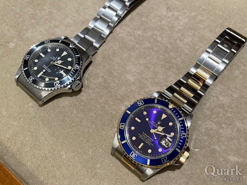 M様、いつもクォーク上野本店をご利用いただき、誠にありがとうございます。以前よりご興味を持たれていた16613でしたが、バイオレットチェンジが入荷したということですぐにご連絡させていただきました。バイオレットチェンジにも様々な個体がございますが、お求めいただいた一本は、完璧で極上の、間違いない一本でございました。インデックスのクリーム色も美しく、ダイヤルはどの角度からみても、正真正銘のバイオレットチェンジでございます!今回で3本目のサブマリーナとなりましたが、それぞれ雰囲気が異なり、並べて眺めるだけでもお楽しみいただけるお時計でございます。また、ぜひ店頭に遊びに来てください!これからもよろしくお願いいたします。