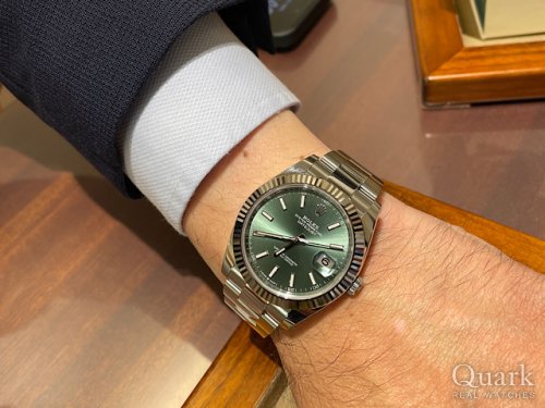 I様 いつもクォーク上野本店をご利用いただき誠にありがとうございます。この度お選びいただきましたDATEJUST41 Ref.126334(ミントグリーン)は2022年に新しいカラーバリエーションとして新たに追加された人気の文字盤となります。高級感のあるフルーテッドベゼルに加え、ロレックスのコーポレートカラーであるグリーンの組み合わせはラグジュアリーウォッチとしての魅力が詰まった素敵なお時計でございます。これからの季節にもピッタリなお時計かと存じますので、I様のコレクション、愛用ROLEXの一つに加えていただけますと幸いです。ブレスレットの洗浄及び調整も無料で行っておりますので、お近くにお越しの際は遊びにいらしてくださいませ。お使いいただく上で何かご不明な点等ございましたら、また林までご相談ください。今後とも末永いお付き合いの程よろしくお願いいたします。