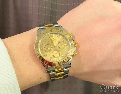 I様 この度は数ある時計店の中からクォーク上野本店をご利用いただき誠に有難うございます。今回ご購入頂いたDAYTONA Ref.116523Gは大人気モデルデイトナの中でもイエローゴールドのコンビとなっており、更にシャンパンダイヤルも合わさって高級感が一層高まっております。また内部機構に関しましては現行モデルと同じものを搭載しており、高精度を維持することが出来ます。そして今後とも末永くお時計をご愛用頂けますようにメンテナンスのご相談はもちろん、ブレスレットの調整や洗浄は無料で行っておりますので、お気軽にクォーク上野本店をご利用頂けたらと思います。また、何かご質問等御座いましたら長谷部までお気軽にご相談下さいませ。今後とも末永いお付き合いの程、宜しくお願い致します。