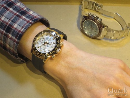 O様 この度は数ある時計店からクォーク上野本店をご利用いただき誠にありがとうございます。今回、ご購入頂きましたDAYTONA Ref.116518LNNG ホワイトシェルはいやらしさを感じさせないイエローゴールドのケースに珍しいシェルの文字盤はO様の腕元にピッタリなお時計となります。上野本店でロレックスについて熱く語られているO様を見ると私も楽しくなってしまい、ついつい話が長くなってしまいます。オイスターフレックスタイプのデイトナが欲しいとの事でしたので、O様にご紹介出来た事、嬉しく思います。また、お近くにお越しの際は遊びにいらしてください。是非永くご愛用いただければ幸いです。お使いいただく上で何かご不明な点等ございましたら、また林までご相談ください。今後とも末永いお付き合いの程よろしくお願いいたします。