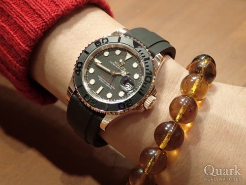 S様 いつもクォーク梅田店をご利用頂き、誠にありがとうございます。今回お求め頂きましたヨットマスターは、ロレックスで初めてラバーベルトが採用された特別な1本です。既にご愛用されているデイデイトのずっしりとした重厚感とは真逆の、軽い装着感でお楽しみ頂ける金無垢モデルかと思います。素材も肌馴染みの良いピンクゴールドですので、使い分けてお楽しみ頂ければ幸いです。ご使用される中で気になる点などございましたら、お気軽にお尋ね下さいませ。今後とも当店を宜しくお願い申し上げます。