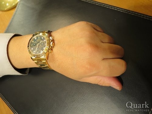 U様、この度はクォーク梅田店をご利用頂きまして誠に有難うございます。今回お選び頂きましたデイトナ Ref.116508Gブラックはイエローゴールドと8Pダイヤの高級感が漂い、圧倒的な迫力がありますね。U様が求めていらっしゃるイメージにピッタリと合うモデルを手に入れて頂けて大変光栄でございます。是非末永くご愛用くださいませ。またお近くを通られる際はお立ち寄り頂ければ幸いでございます。今後共当店を宜しくお願い致します。