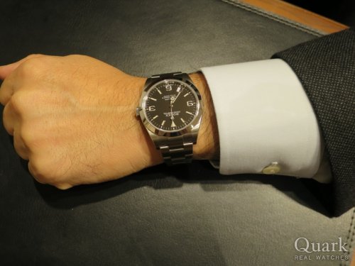 所有している時計が全て白文字盤の革タイプだったので黒文字盤のブレスタイプが欲しいと思っていました。現行のエクスプローラーIは39ミリで大きく、視認性も良いのでこのモデルを選びました。