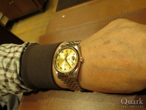 T様、この度はクォーク梅田店をご利用頂きまして誠に有難うございます。今回お選び頂きましたデイトジャスト Ref.16233シャンパンローマはロレックスの定番モデルとして広く知られています。イエローゴールドの華やかさと少しクラシックな落ち着いた雰囲気がT様にとてもよくお似合いでした。以前ご使用されていたモデルと操作方法が異なる部分がございますので、何かご不明な点がございましたらお気軽に仰ってくださいませ。今後とも末永いお付き合いの程、宜しくお願い致します。
