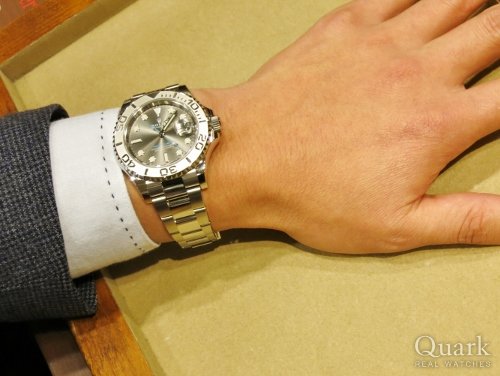 T様、この度はクォーク仙台店をご利用頂き、誠にありがとうございます。記念すべきファーストロレックスご購入のお手伝いができ、大変光栄でございます。ヨットマスターの新しい文字盤「ダークロジウム」は、お写真のようなスーツスタイルにも、夏場の半そでなどのカジュアルスタイルにも抜群にマッチするものと存じます。末長くご愛用頂けますよう、精一杯お手伝いさせて頂きます。引き続きまして、何卒宜しくお願い申し上げます。