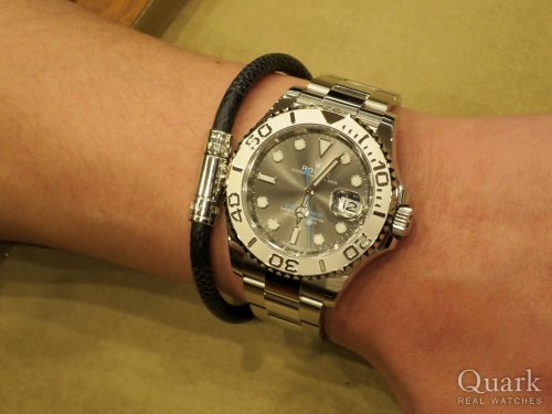 沖縄好きの私が、今度YACHT-MASTERを着けて沖縄に行きたいと思い購入を検討。海を連想するRef.116622の青文字盤を購入しようとクォークさんに行ったら、たまたま新作のダークロジウム文字盤を見掛けて、心が奪われました。ダークロジウムの文字盤の方がシンプルで、私好みの色合いでした。