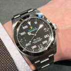エアキングの誕生から70年以上、オイスターパーペチュアルの34mmラインへと引き継がれるまで変更のなかったケース径は堂々の40mmに拡大され、前モデルより採用された丸みを帯びたドームベゼルもスタイリッシュなスムースベゼルへと変更された。