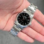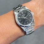 小振りなサイズ感とシンプルなデザインが、長くお付き合いするのにはもってこいなモデルだと思います。おじいさんになっても使える、そんなモデルではないでしょうか。個人的にはブラックダイヤル、そしてシルバーレターの組み合わせが、高級感とシックな雰囲気をさりげなく漂わせていて好きです。