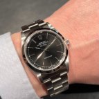 小振りなサイズ感とシンプルなデザインが、長くお付き合いするのにはもってこいなモデルだと思います。おじいさんになっても使える、そんなモデルではないでしょうか。個人的にはブラックダイヤル、そしてシルバーレターの組み合わせが、高級感とシックな雰囲気をさりげなく漂わせていて好きです。