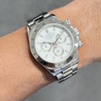 爽やかな印象のホワイトダイヤルは、視認性に長けておりエレガントさを追求するユーザーからの支持が高い。ブラックダイヤルに比べ販売本数は劣るが、並行輸入店での価格相場は約10万円安く、後にメーカーでのダイヤル交換も可能となる為、近年ホワイトダイヤルの人気も上昇している。