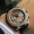 ダイヤがふんだんにセッティングされたベゼルに加え、ブラックシェルダイヤルと8Pダイヤが更なる輝きと魅力をもたらし、見た者を惹きつけるモデルです。