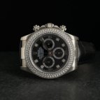 ダイヤがベゼルに贅沢にセッティングされた豪華なモデル。ベルトがレザーの為どこか落ち着いた雰囲気もあり、独特な魅力を感じさせてくれます。