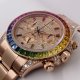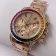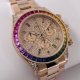 レインボーグラデーションのサファイアベゼル、インデックスに加え、ダイヤルにも無数のダイヤが敷き詰められており、見る者を圧倒させる輝きを放つモデルです。