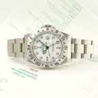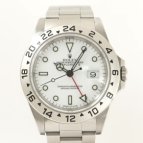 ホワイト文字盤のスポーツモデルが欲しかったのですが、種類は意外と少なく、デイトナは予算オーバーで手頃なものを探していたところエクスプローラーIIを発見。現行モデルとも悩みましたが、私の手首にフィットするのはコチラでした。ホワイト文字盤は清潔感があって、スーツにも合わせやすく重宝しています。