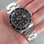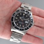 GMTマスターIの黒ベゼルを10年くらい愛用してます。中古で買った時は安かったのに今は凄く高くなっていてビックリしてます!!最初はGMTマスターIIを買う予定でしたが、日付を合わせるのがすこし面倒だったのと、店員さんからコンディションが良いのでお勧めですよ、と言われ購入することに。他のブランドの時計も持っていますが、ほぼ毎日使っている超お気に入りの1本です。この前オーバーホールして絶好調で動いてますので、これからもガンガン使って味を出していきます!!