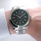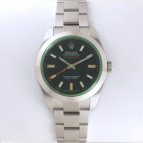 サファイアクリスタル風防をロレックスのコーポレートカラーに当たるグリーンで彩ったミルガウスでございます。