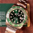 2003年にSUBMARINER誕生50周年を記念し発表されたRef.16610LVの次期モデルとして、デザインを受け継ぎながら、ダイヤルカラーをブラックからグリーンへ変更。長期間にわたり鮮やかな色彩を保持する耐蝕性と、耐傷性に優れたセラミックベゼルを搭載し、2010年にリニューアルを果たしたグリーンサブマリーナーRef.116610LV。水深300m(1,000フィート)でも信頼性と精度が保証されるといった長いサブマリーナーの歴史を受け継ぎながらも、随所に新しい技術を取り入れ、Ref.116610LN同様、高級感溢れるデザインと耐久性で、確固たる人気を築いている。ケースラグ部分の大型化によりさらに耐久性を高め、独自開発されたブルーパラクロム・ヒゲゼンマイの採用で耐磁性・耐衝撃性が向上。ベゼルにはプラチナ特殊コーティングが施された60分の目盛りが刻まれ、潜水時間と減圧停止を正確に測定することが可能。ブレスレットは、前モデルでは中空だった中央のリンクパーツがソリッドパーツに変更され堅牢性がアップ。バックルは堅牢性、高級感、実用性といったあらゆる面から改良が加えられた新型バックル、グライドロッククラスプを採用。使用者本人が工具なしでもブレスの長さ調節が容易にできるようになった。また、発光時間がルミノバ夜光塗料の約2倍(8時間)という長さのクロマライトを採用するなどサブマリーナーはダイバーズウォッチとして進化し続けている。
