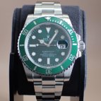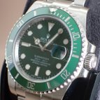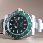 2003年にSUBMARINER誕生50周年を記念し発表されたRef.16610LVの次期モデルとして、デザインを受け継ぎながら、ダイヤルカラーをブラックからグリーンへ変更。長期間にわたり鮮やかな色彩を保持する耐蝕性と、耐傷性に優れたセラミックベゼルを搭載し、2010年にリニューアルを果たしたグリーンサブマリーナーRef.116610LV。水深300m(1,000フィート)でも信頼性と精度が保証されるといった長いサブマリーナーの歴史を受け継ぎながらも、随所に新しい技術を取り入れ、Ref.116610LN同様、高級感溢れるデザインと耐久性で、確固たる人気を築いている。ケースラグ部分の大型化によりさらに耐久性を高め、独自開発されたブルーパラクロム・ヒゲゼンマイの採用で耐磁性・耐衝撃性が向上。ベゼルにはプラチナ特殊コーティングが施された60分の目盛りが刻まれ、潜水時間と減圧停止を正確に測定することが可能。ブレスレットは、前モデルでは中空だった中央のリンクパーツがソリッドパーツに変更され堅牢性がアップ。バックルは堅牢性、高級感、実用性といったあらゆる面から改良が加えられた新型バックル、グライドロッククラスプを採用。使用者本人が工具なしでもブレスの長さ調節が容易にできるようになった。また、発光時間がルミノバ夜光塗料の約2倍(8時間)という長さのクロマライトを採用するなどサブマリーナーはダイバーズウォッチとして進化し続けている。